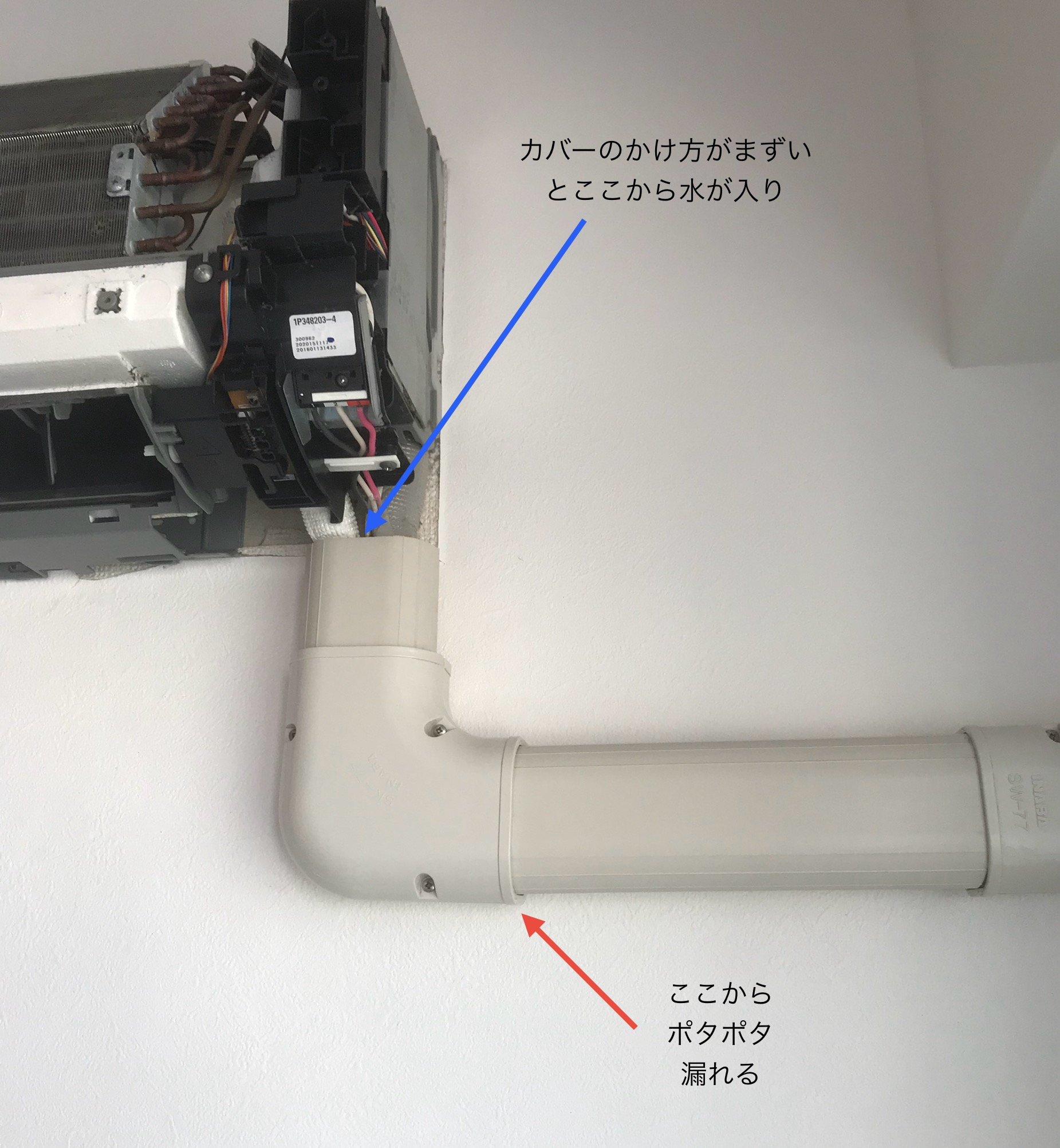 水漏れの発生箇所: 水は、エアコン本体の下部ではなく、ドレンの化粧カバー(配管カバー)の継ぎ目から滴下していました。