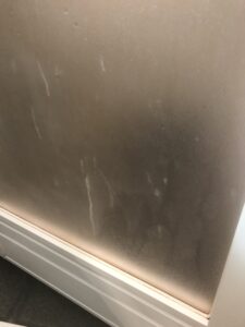この写真のように、お風呂の扉のアクリル板(すりガラス状のパネル)に見られる白い筋状の垂れ跡も、「水垢の垂れ跡だ」「業者が落とし残した」と勘違いされやすい、非常に厄介な事例です。