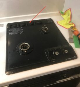 さて、いよいよ本題です。タカラスタンダード製ガスコンロの天板を外し、奥に溜まった油汚れを清掃するための手順に入ります。
