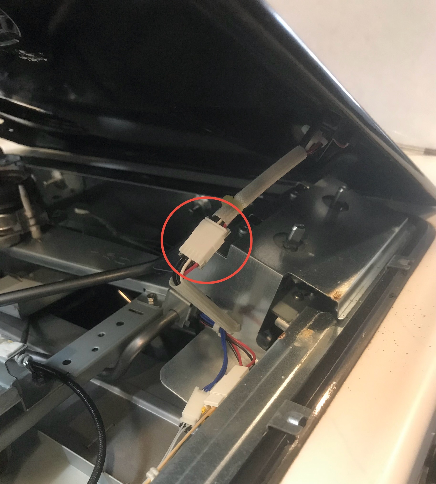 配線の存在を確認し、天板を少し傾けた状態になると、次の難関がこのコネクタの取り外しです。