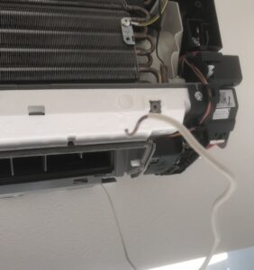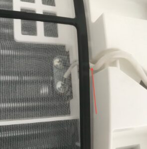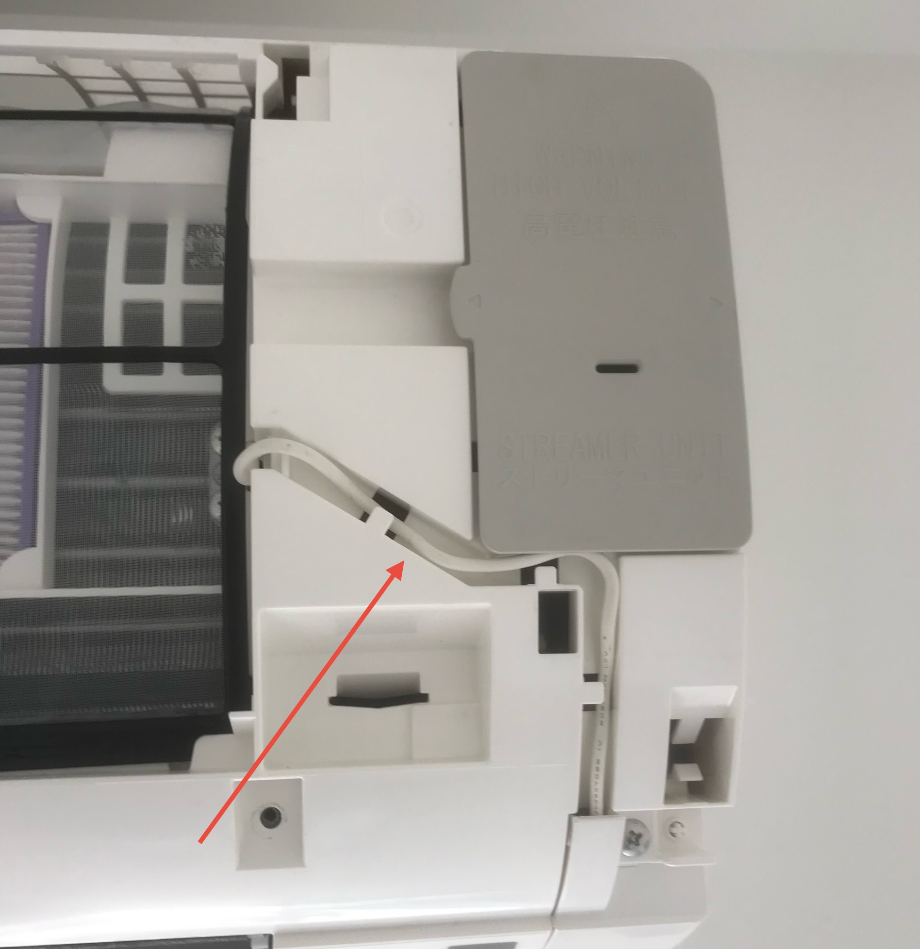 たるんでいる余分なアース線を、カバー装着後に邪魔にならないよう、エアコン本体内部の空洞部分や部品に干渉しない隙間にそっと押し込みます。