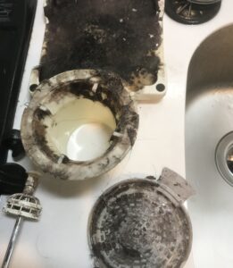 蓋を開けた瞬間、裏側は粘性の高いヌメリで真っ黒。ここまでの状態になると、もはや通常の清掃作業の範疇を超え、徹底的な根気が求められます。ゴミ受けのキャッチ部分を開けても、中のパーツ全てがベトベトに汚染されている状態でした。