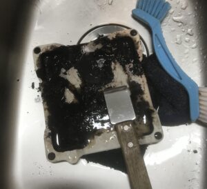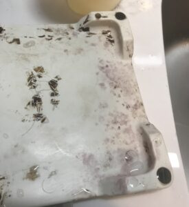 蓋を開けると裏側がぬめりで真っ黒… ここまでくると流石に簡単には綺麗になりません。根気が入ります。