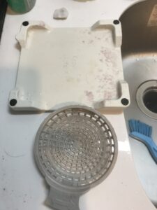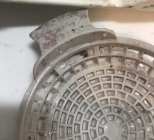 ハウスクリーニングの現場で最も厄介な敵の一つが、お風呂場の排水溝パーツにこってりと染み付いた赤紫色の変色です。