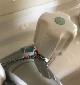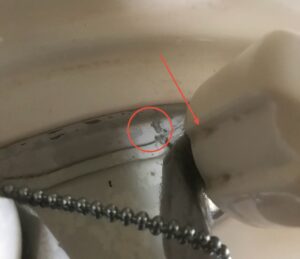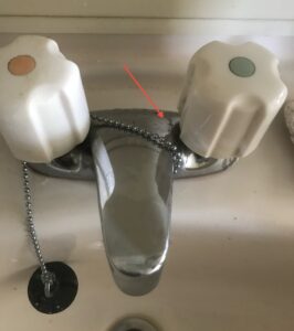 このタイプの蛇口は、裏側や付け根の隙間が本当に洗いにくい。特に、赤い矢印の部分には、カチカチに固まったカルキ汚れ(水垢)がびっしり。