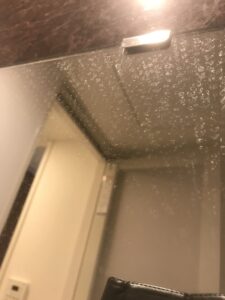 ウロコ汚れとは別に、鏡の表面に元々ついていた深い傷や、ウロコ汚れが長期間付着し続けたことによる点々状の「化学変化(シミ)」は、どんなにプロが頑張っても除去することはできません。