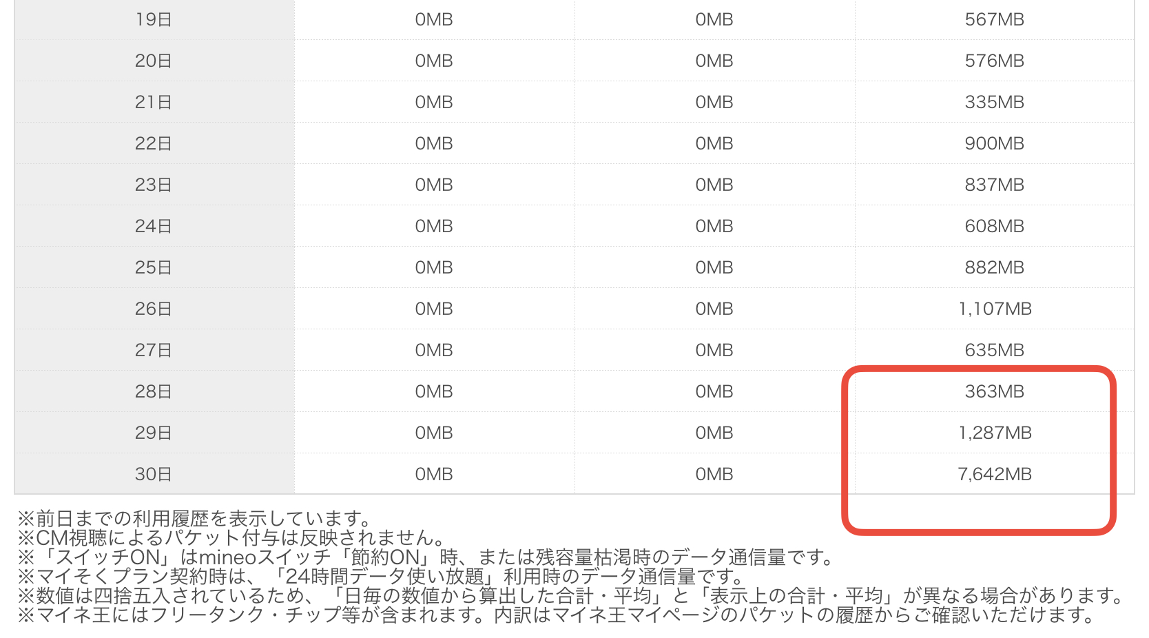 更新完了後、もしmineoからアラート(「直近2日間で7GB超過」など)が届いたら、その日のうちに「節約OFF」に切り替えます。