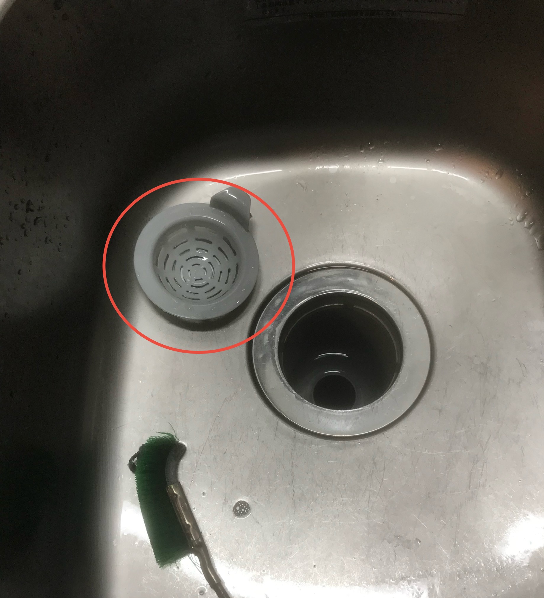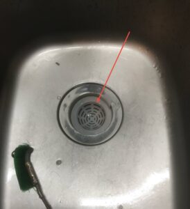 【設備復元】 シンクの上に置いておいた本来のゴミ受けを、元の位置にセットし直す。
