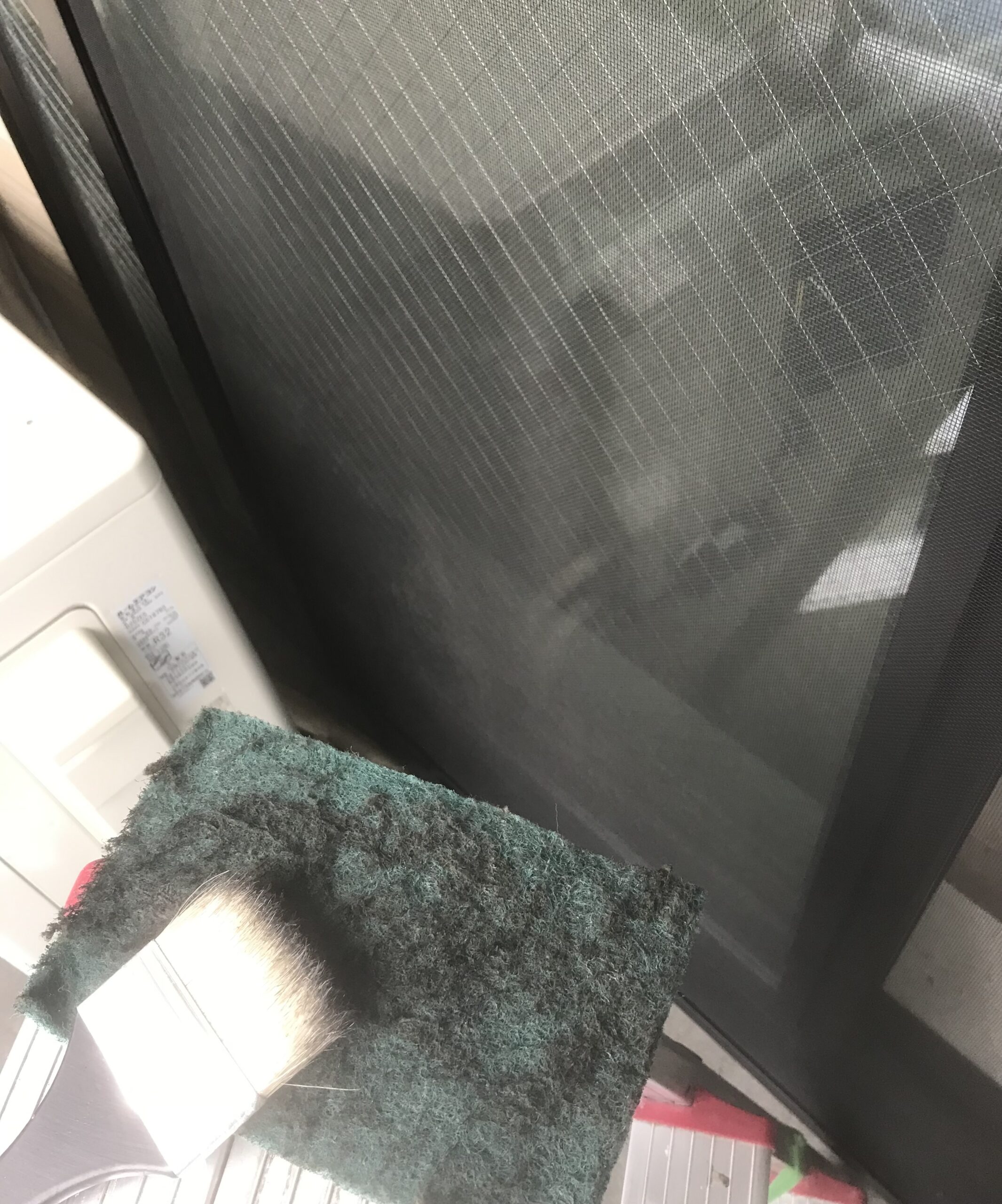 水分がないため、スコッチの繊維が汚れをかき出し、驚くほど吸い取ってくれます。この段階で、網戸の見た目は大きく改善します。