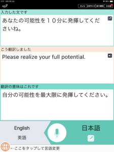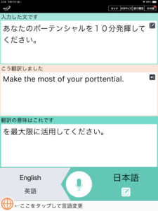 そして、「10分」と認識されてしまう曖昧な音の「十分」ではなく、「最大限に」というより明確な熟語を使ったことで、アプリは文脈を考えて訳してくれました。