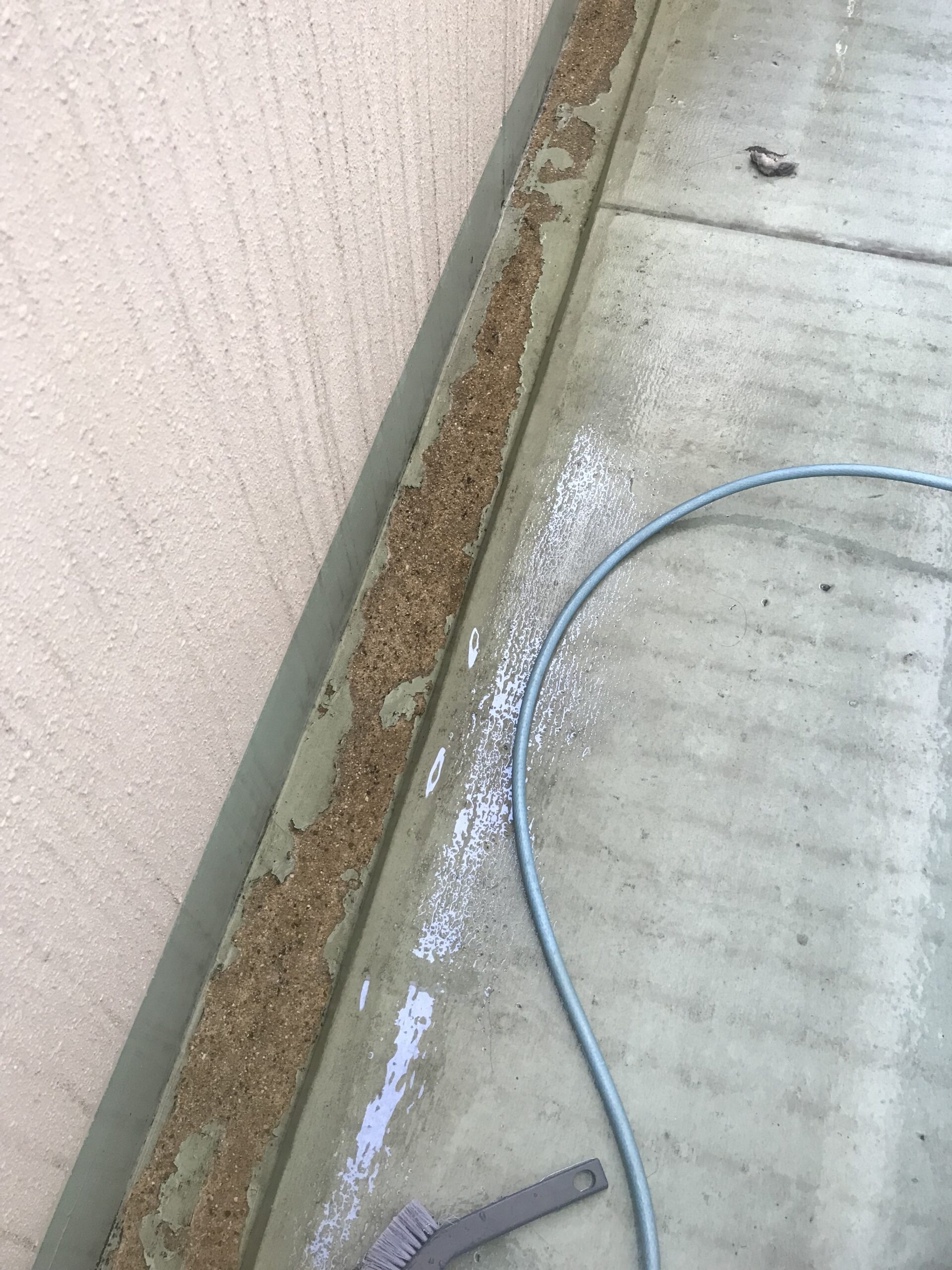 写真のように、長年の汚れが溜まったベランダの溝は、擦ると塗装が剥がれるリスクがあります。