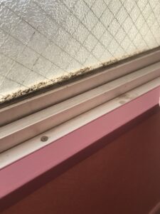 窓のゴムパッキンには黒ずみが溜まり、網入りガラスの隅まで埃が入り込んでいます。