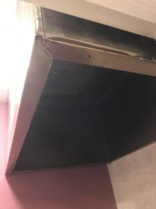 レンジフードはステンレスの輝きが失われ、工事の粉塵と油が混じった膜で曇っています。