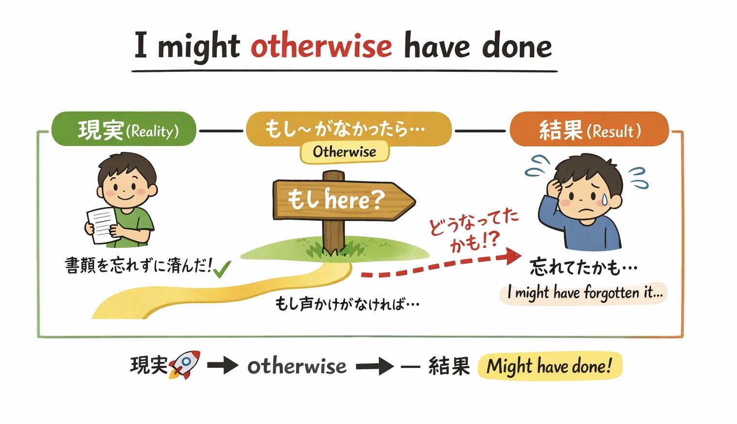 このように might otherwise have done を使うと、日常のちょっとした助けに対する感謝も自然に英語で表現できます。