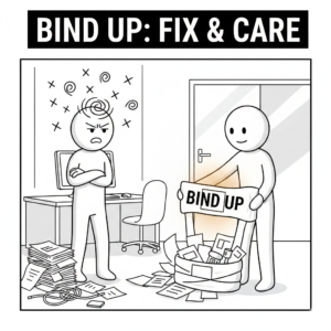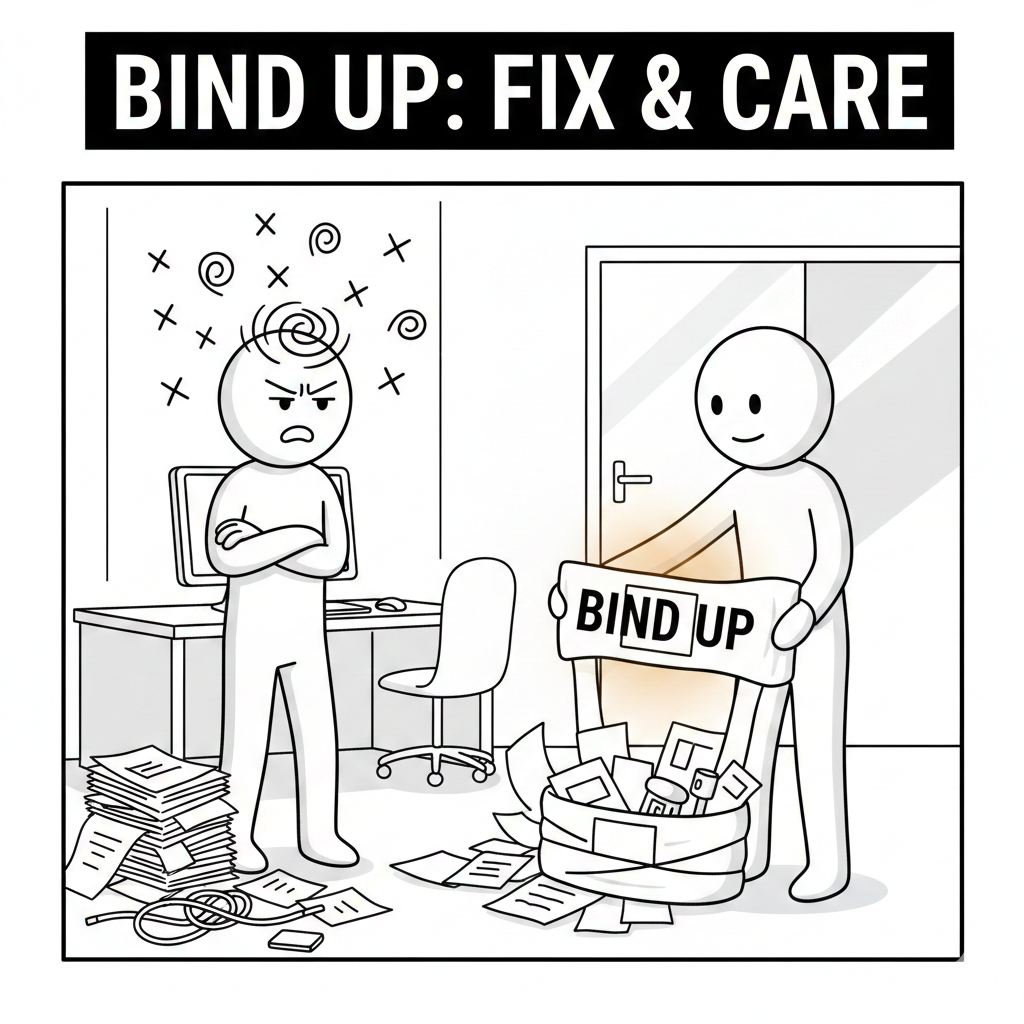 bind up は、散らかったタスク、傷ついた心、壊れかけた関係を、力任せではなく丁寧に結び直すための温かい英語表現です。