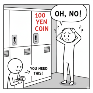 “You need a 100-yen coin for this locker. It’s just a deposit, so you’ll get it back later!” (このロッカーには100円玉が必要です。預け金なので、後で戻ってきますよ!)