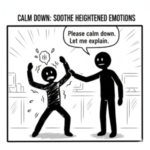 “Let’s calm down” や “Please” を添えると柔らかくなります。