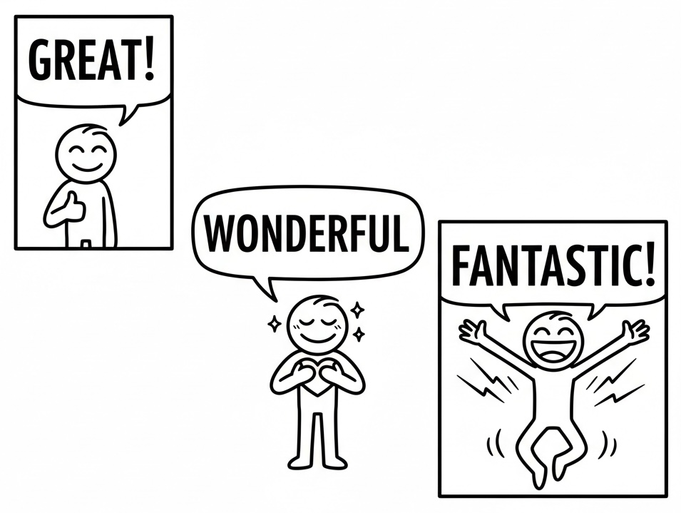 👉 great は理性寄り、wonderful は感情寄り、fantastic はテンション爆発