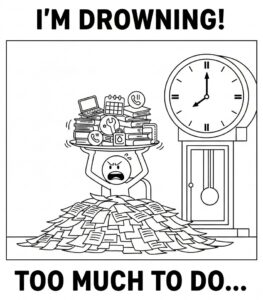 まさにこのイラストのような状態になったら、”I’m swamped!” や “I’ve got a lot on my plate.” の出番です。言葉にすることで、周りにも「今は助けが必要だ」というサインを出すことができますよ。