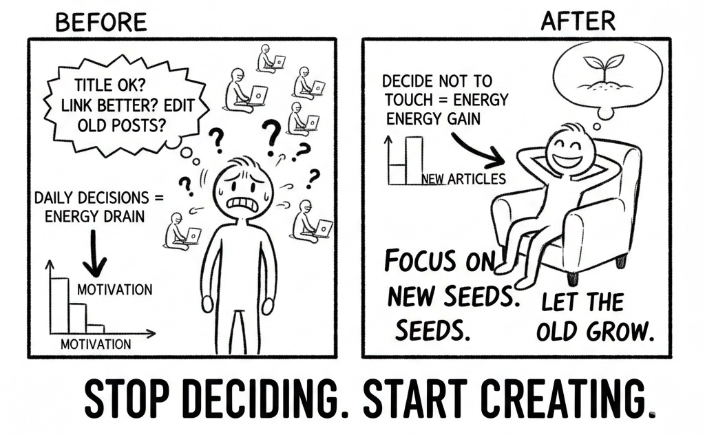 「タイトルはこれでいいのか?」「リンクはこっちの方がいいか?」 毎日繰り返されるこの小さな決断が、あなたの精神力をジワジワと削り、本来注ぐべき「新しい記事へのエネルギー」を奪っています。